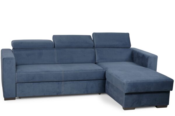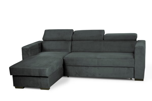 Nowoczesny i wygodny narożnik Lazio łączy elegancję i funkcjonalność. Wyposażony w 3 regulowane zagłówki, funkcję spania typu „delfin” oraz pojemnik na pościel, idealnie sprawdzi się w każdym salonie. Wykonany z wysokogatunkowej pianki HR, sprężyn falistych i pasów tapicerskich gwarantuje trwałość i komfort.