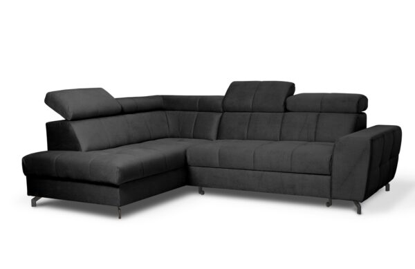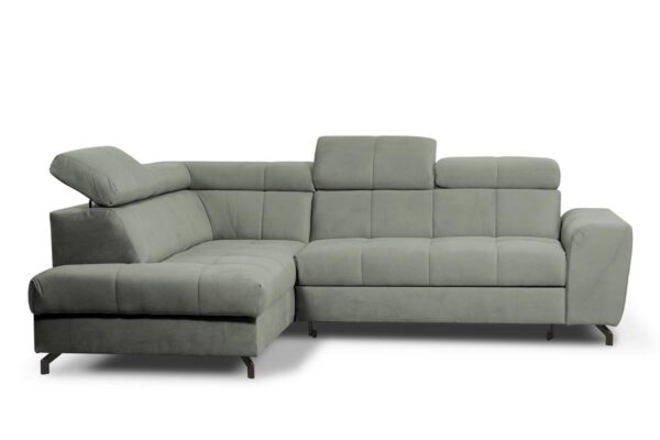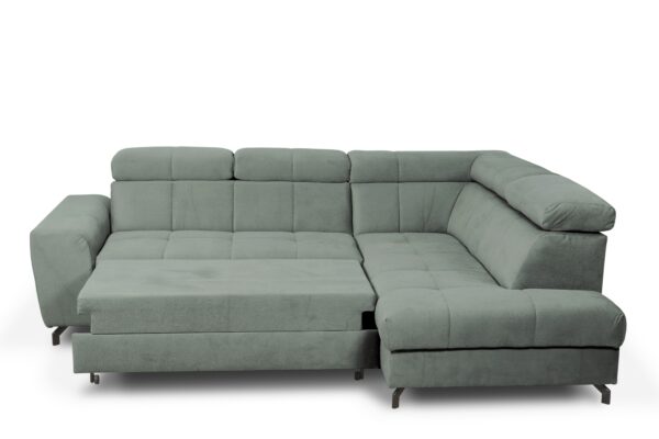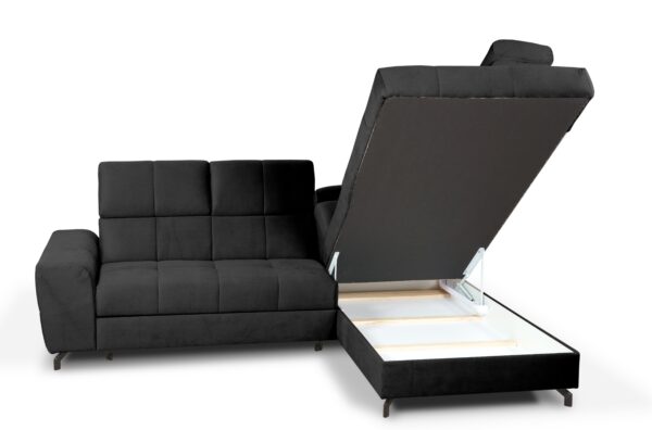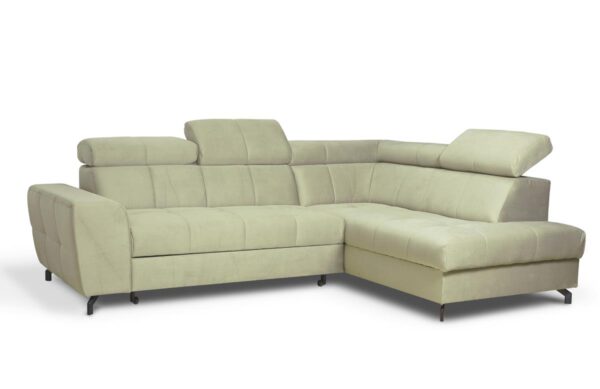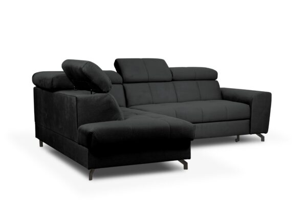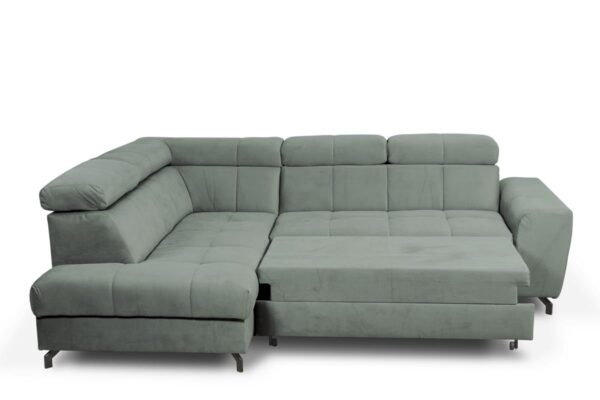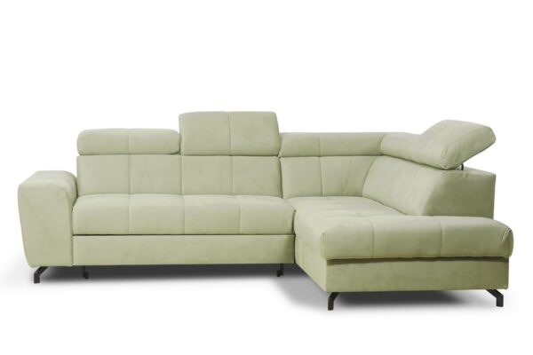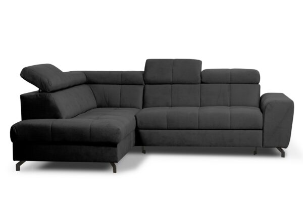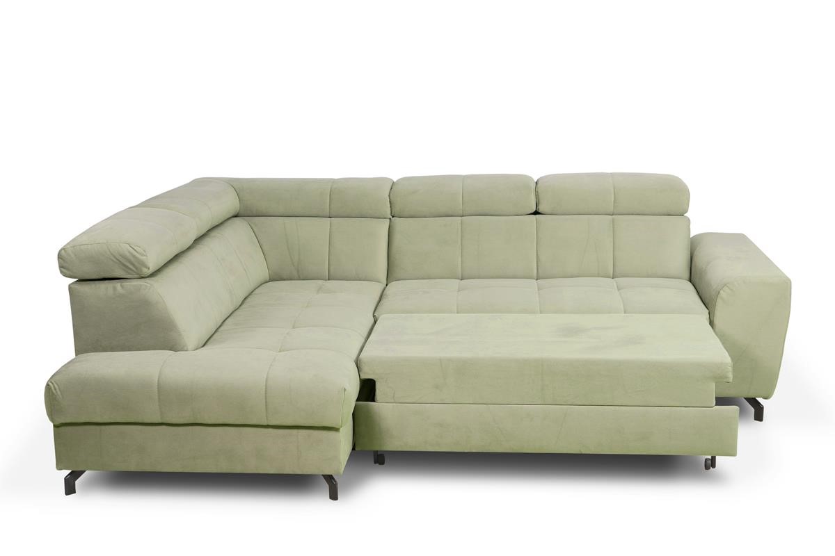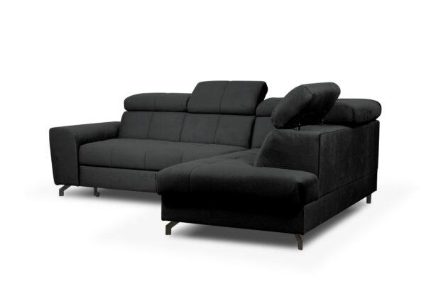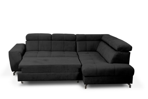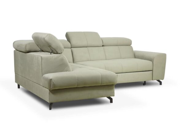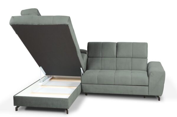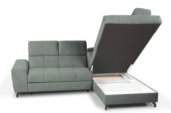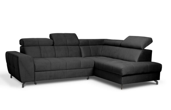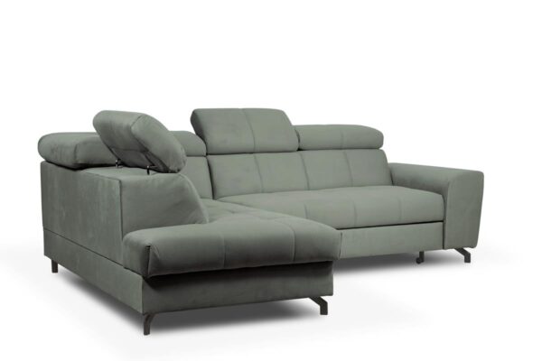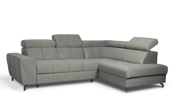 Dodatkowym atutem jest pojemnik na pościel w otomanie, który ułatwia przechowywanie kołder, poduszek i koców, pomagając utrzymać porządek w salonie. Model LeMans dostępny jest w wersji lewej i prawej, co pozwala dopasować go do układu pomieszczenia.