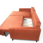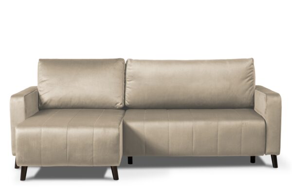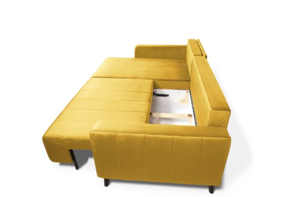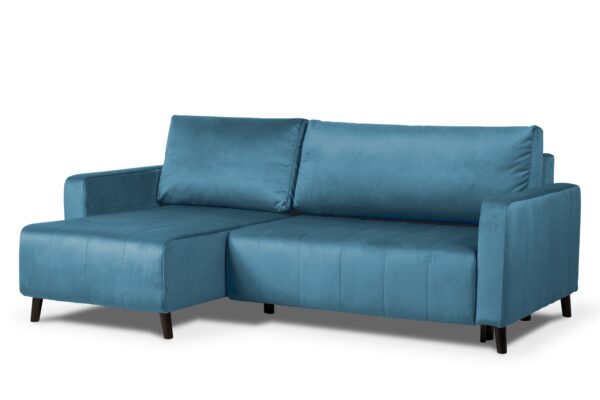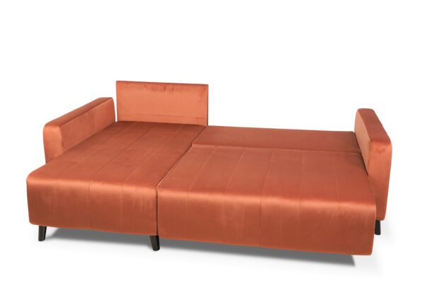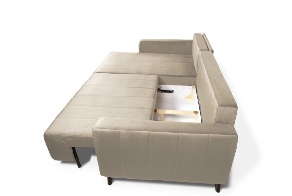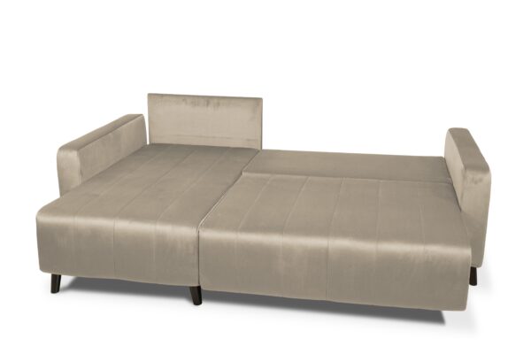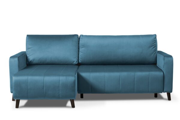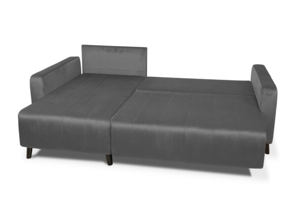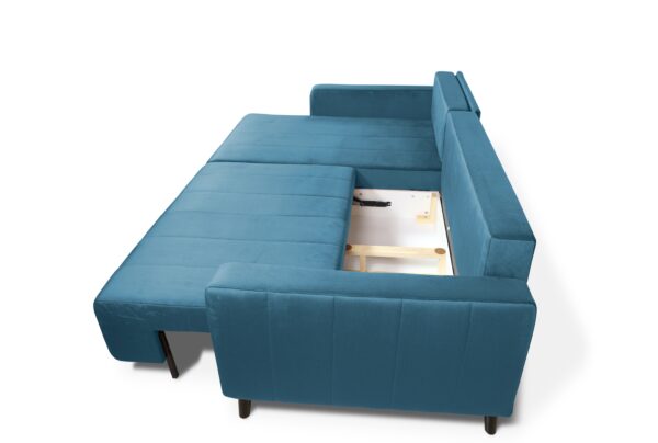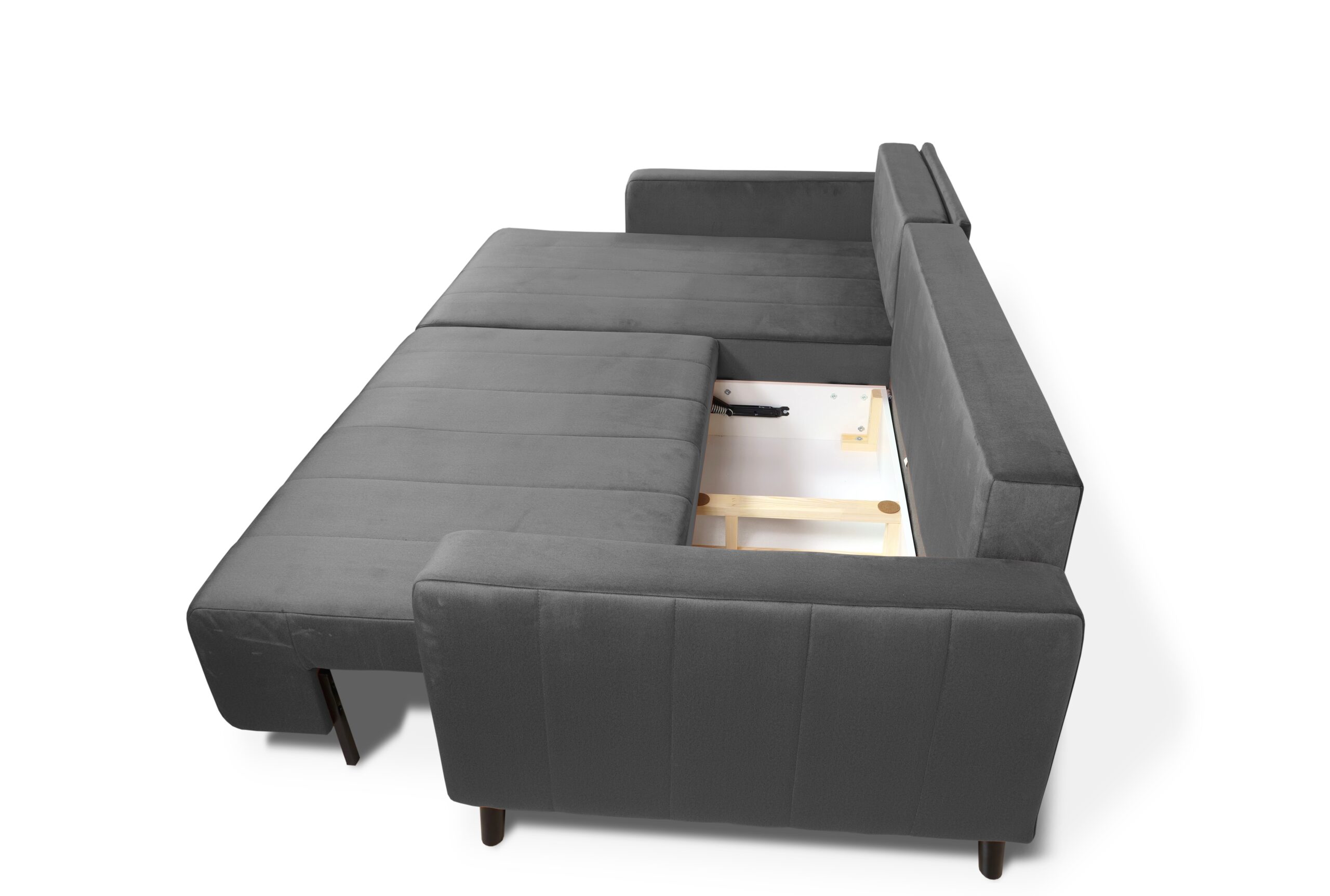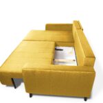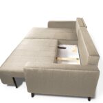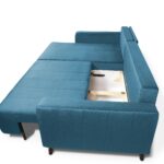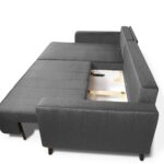 Dodatkowym udogodnieniem jest pojemnik na pościel w kolorze białym, umieszczony w otomanie – idealny do przechowywania koców, kołder i poduszek. Dzięki swojej konstrukcji narożnik jest uniwersalny, co pozwala ustawić go zarówno w wersji lewej, jak i prawej, w zależności od potrzeb aranżacyjnych.