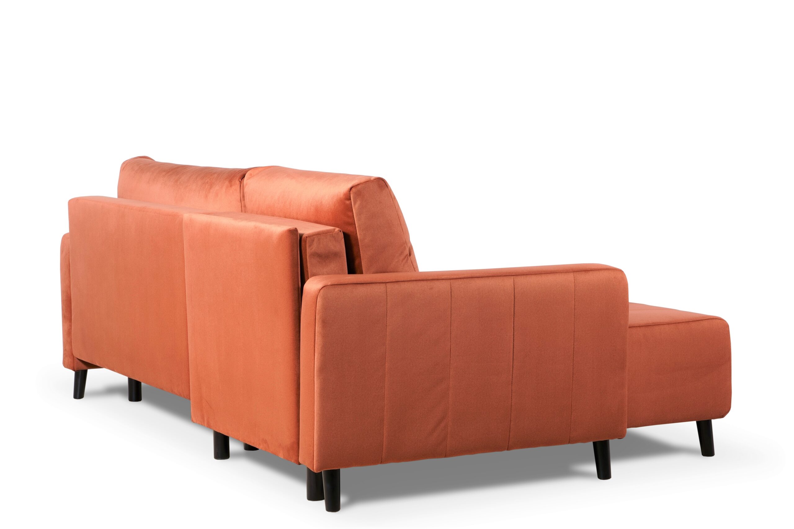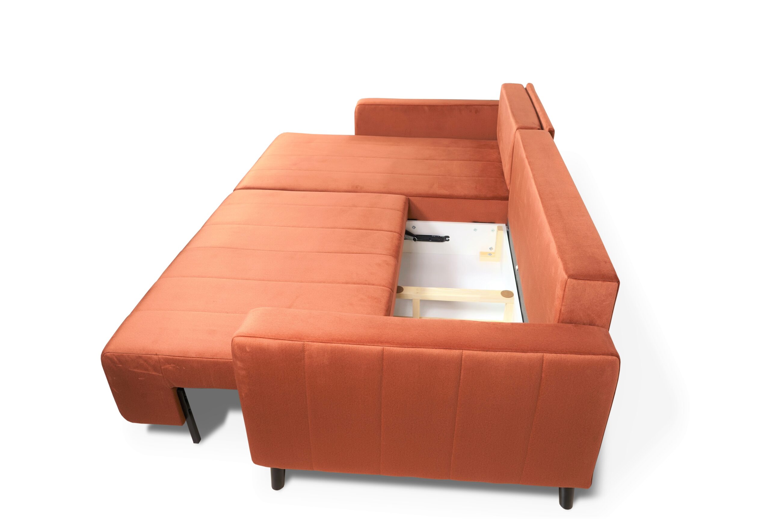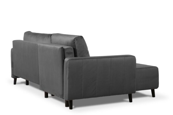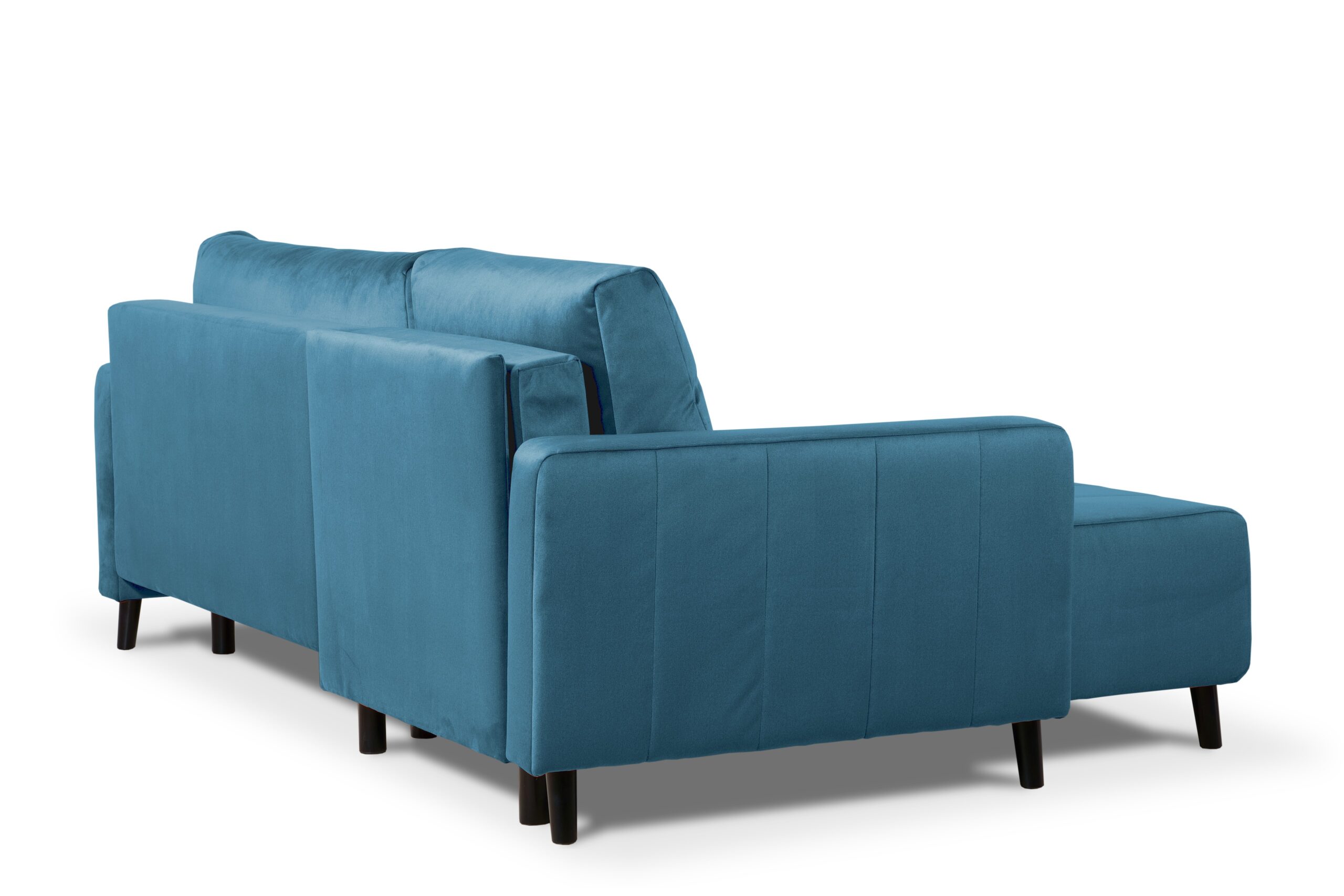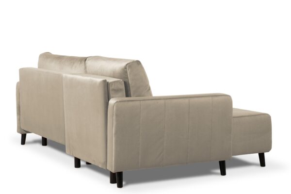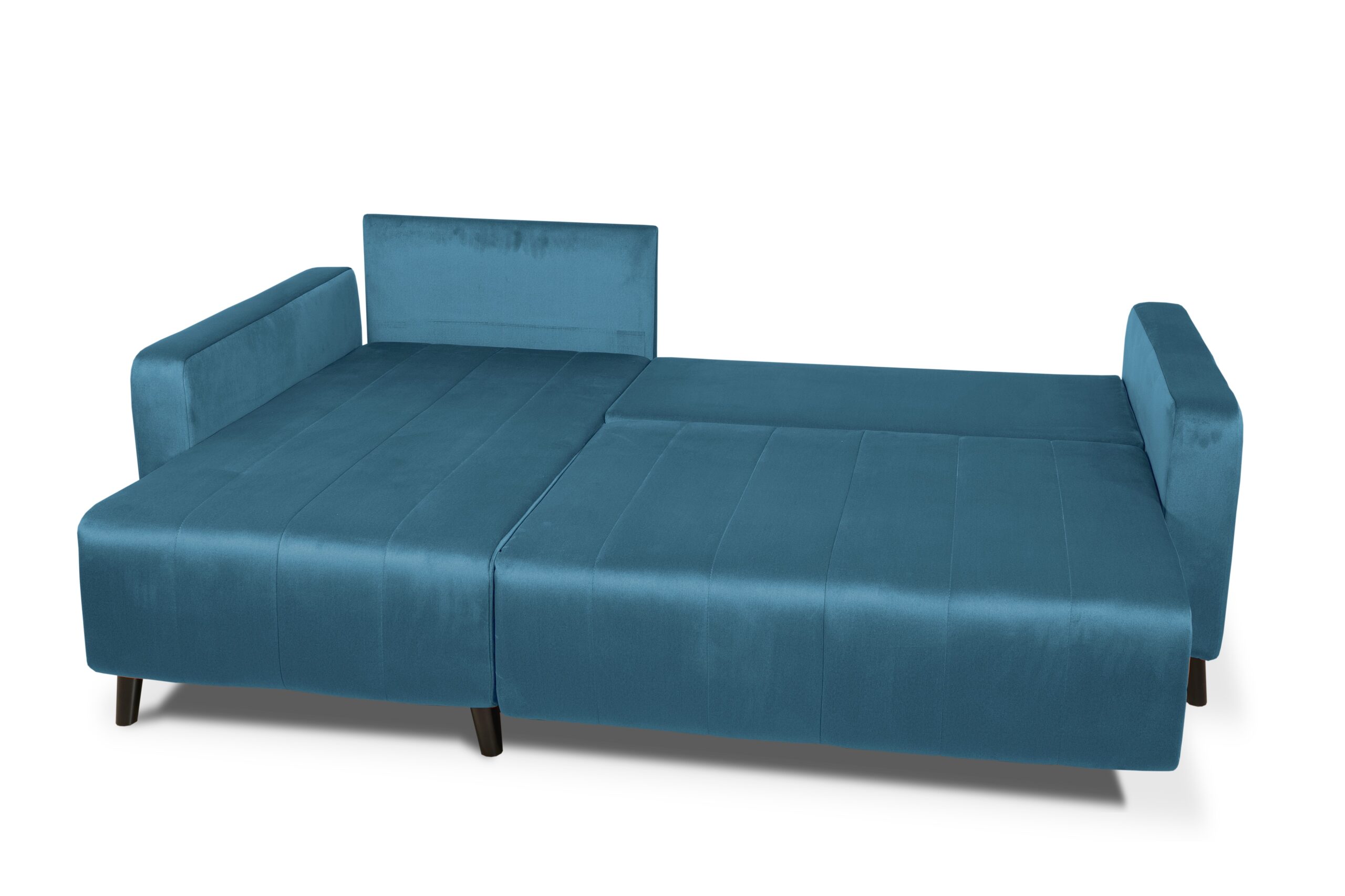 Dodatkowym udogodnieniem jest pojemnik na pościel w kolorze białym, umieszczony w otomanie – idealny do przechowywania koców, kołder i poduszek. Dzięki swojej konstrukcji narożnik jest uniwersalny, co pozwala ustawić go zarówno w wersji lewej, jak i prawej, w zależności od potrzeb aranżacyjnych.