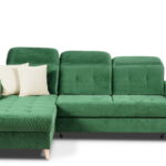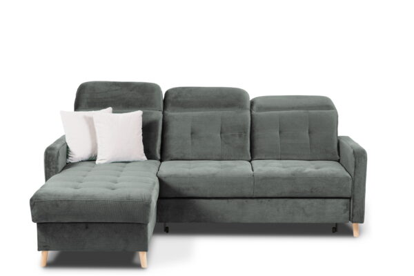 Dodatkowym atutem jest pojemny schowek na pościel umieszczony w otomanie w kolorze białym – idealny do przechowywania koców, kołder i poduszek. Narożnik posiada również trzy ruchome zagłówki, które można regulować według własnych preferencji, zapewniając maksymalny komfort podczas odpoczynku.