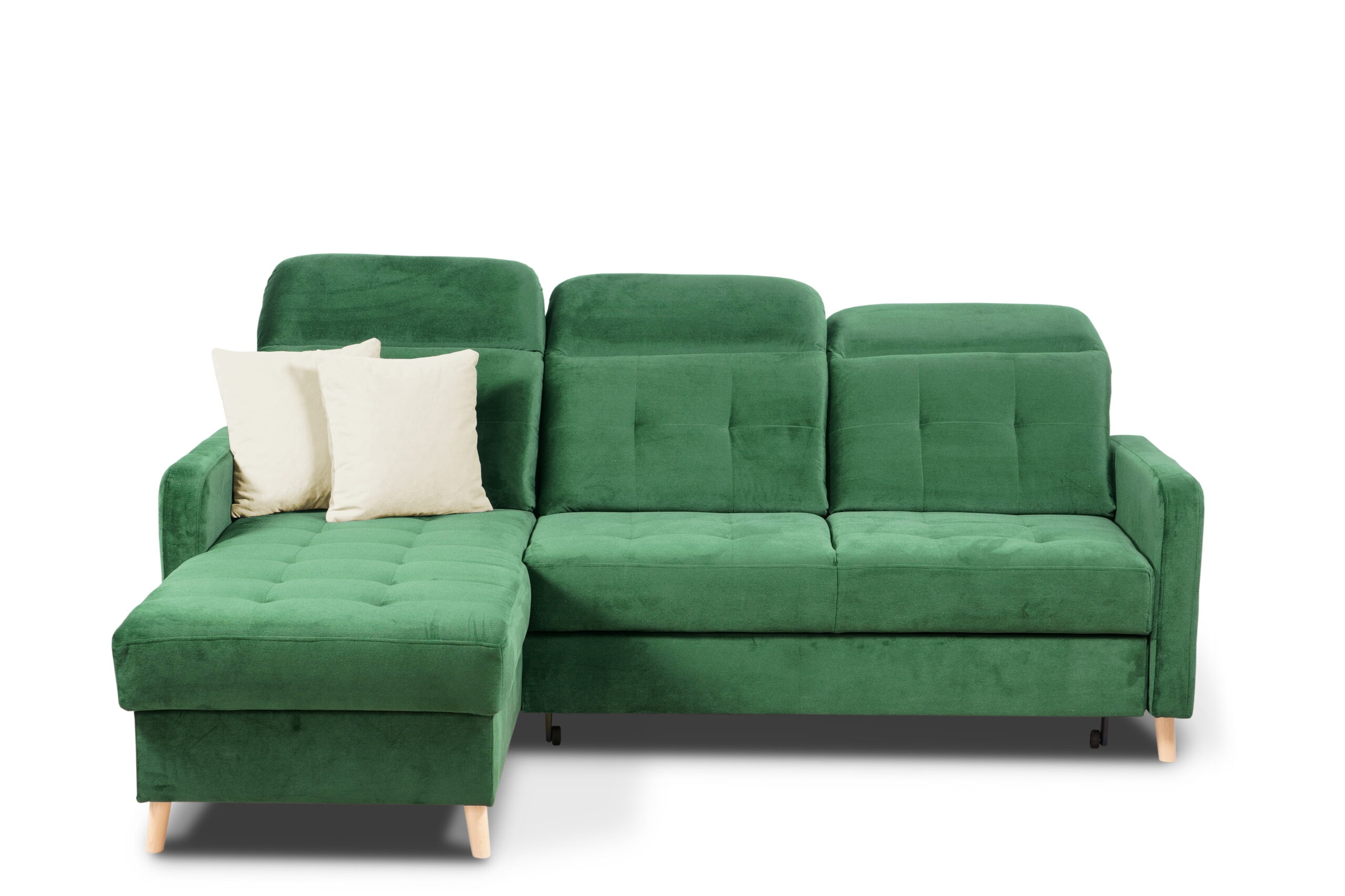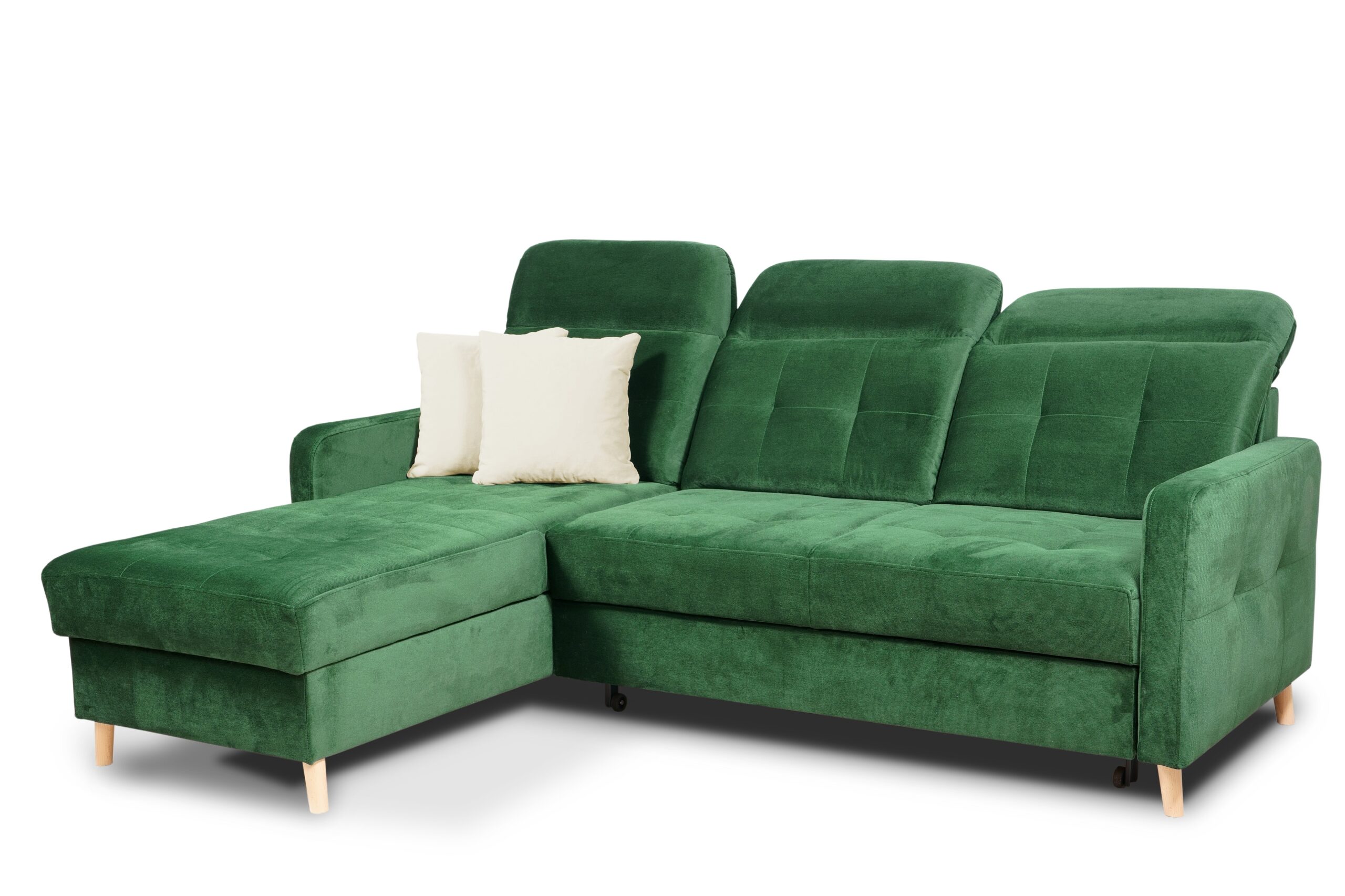 Dodatkowym atutem jest pojemny schowek na pościel umieszczony w otomanie w kolorze białym – idealny do przechowywania koców, kołder i poduszek. Narożnik posiada również trzy ruchome zagłówki, które można regulować według własnych preferencji, zapewniając maksymalny komfort podczas odpoczynku.