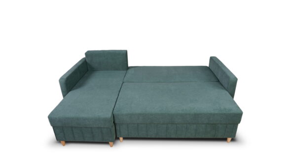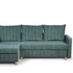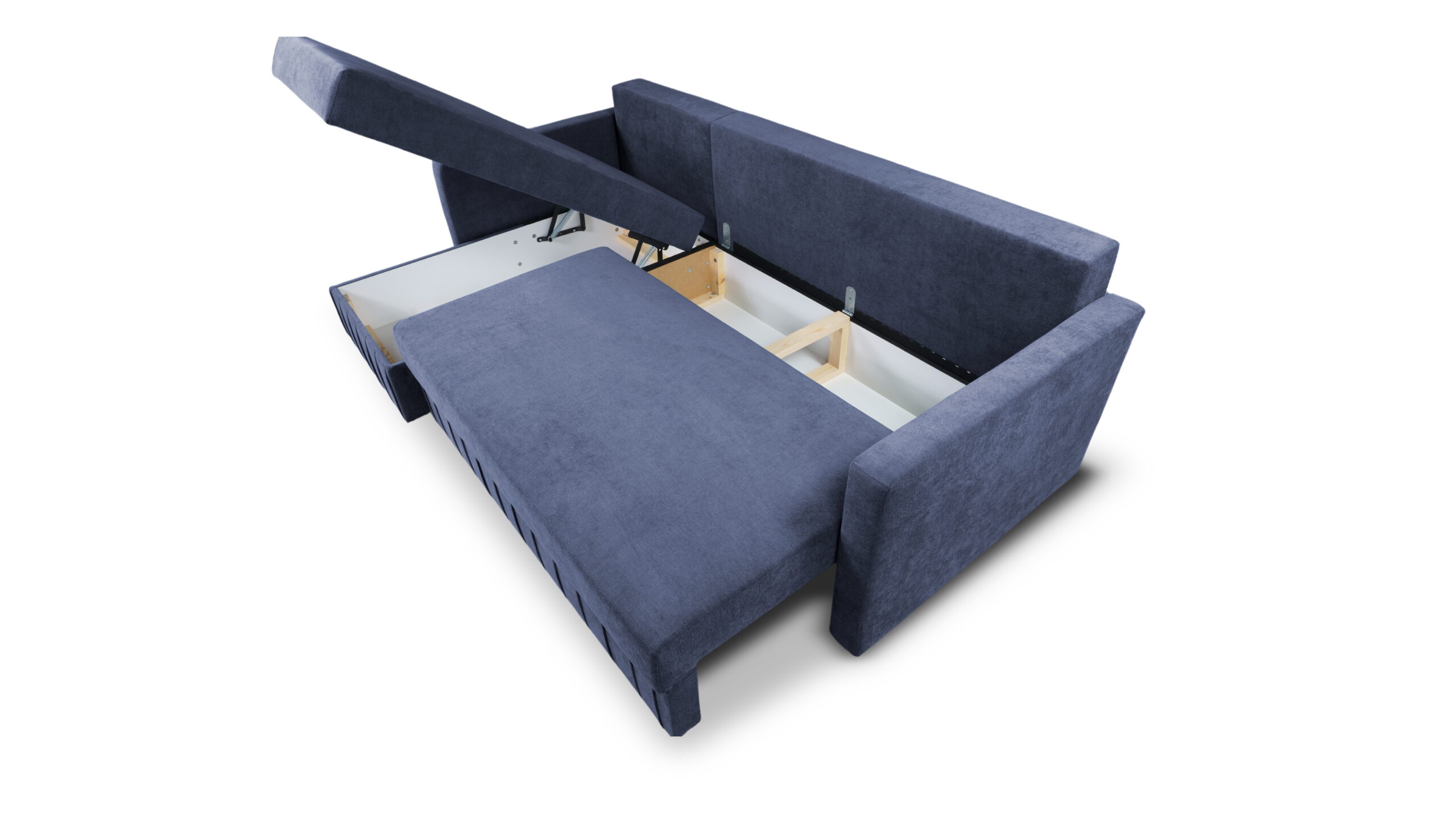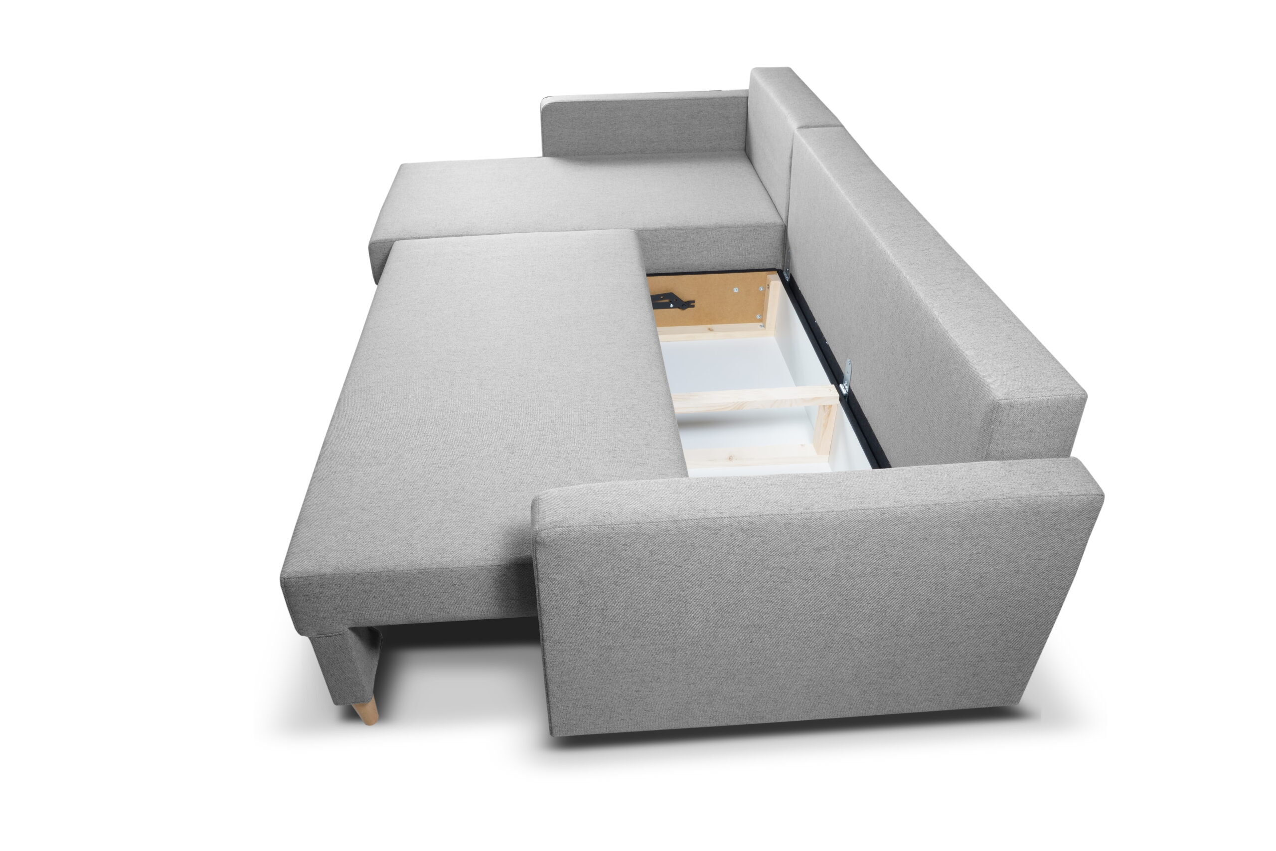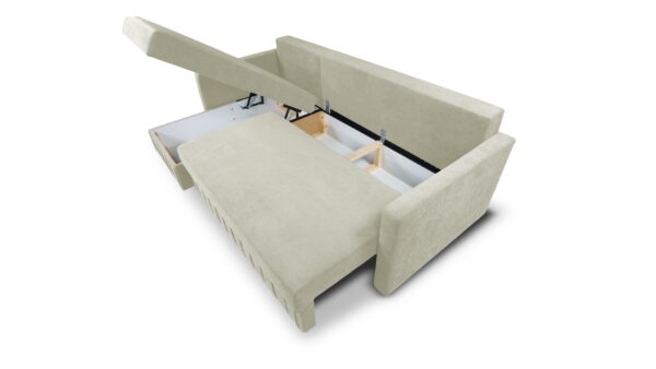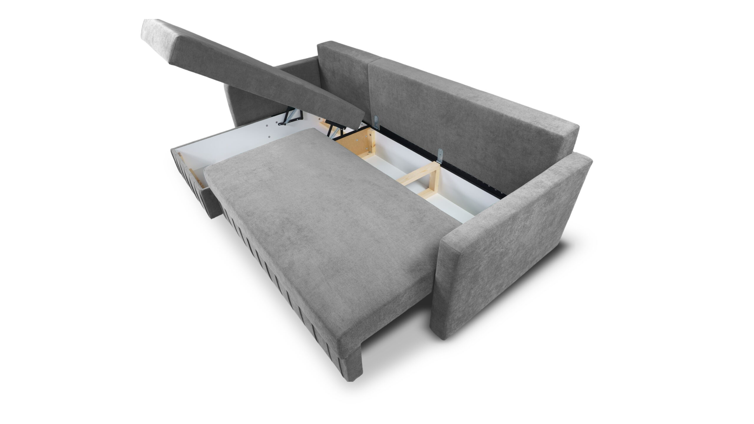 Siedzisko narożnika zostało wyposażone w sprężyny bonell, które gwarantują elastyczność, stabilność i komfort, a jednocześnie zapewniają trwałość na długie lata. Model posiada dwa pojemniki na pościel, dzięki czemu idealnie sprawdza się w mniejszych przestrzeniach, gdzie liczy się każdy centymetr miejsca do przechowywania.