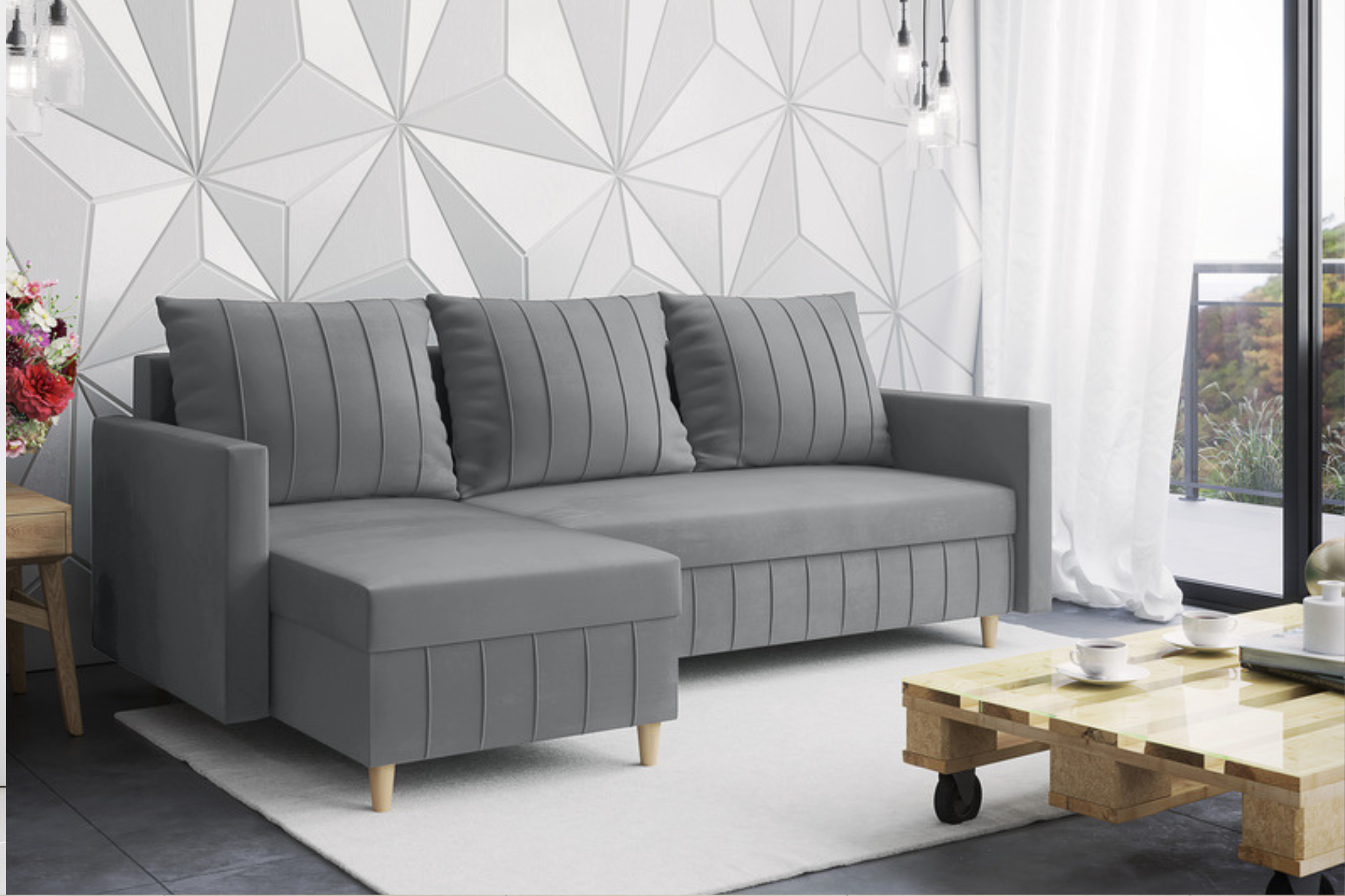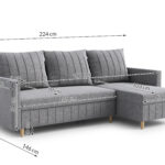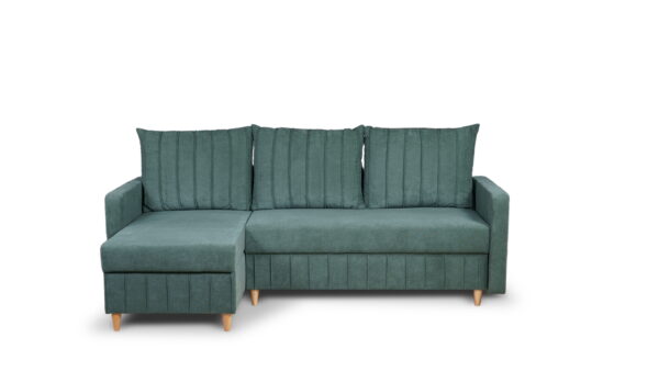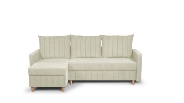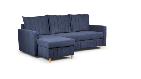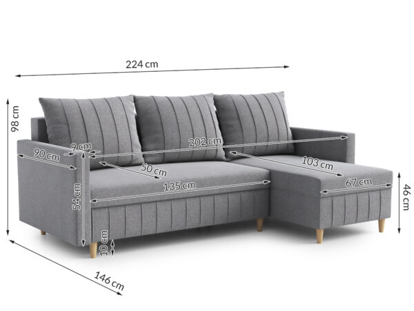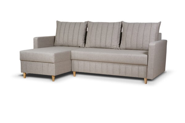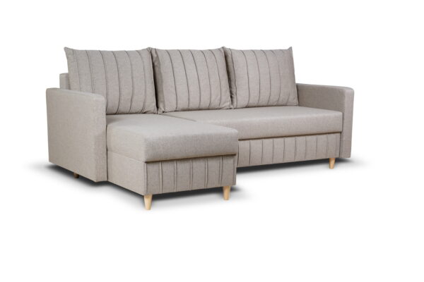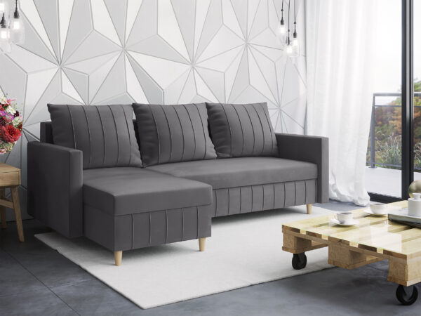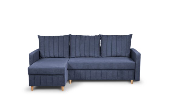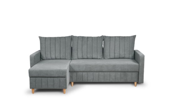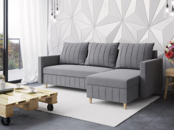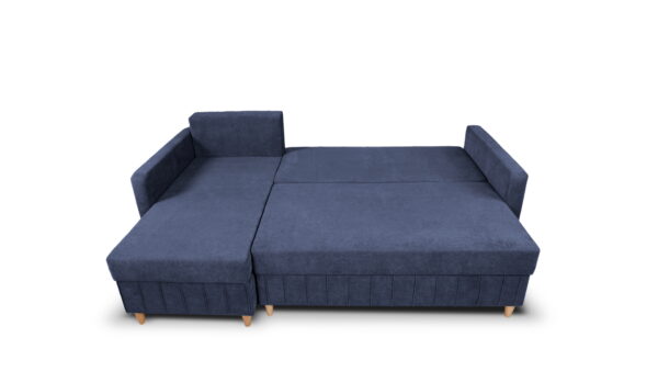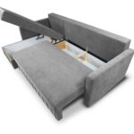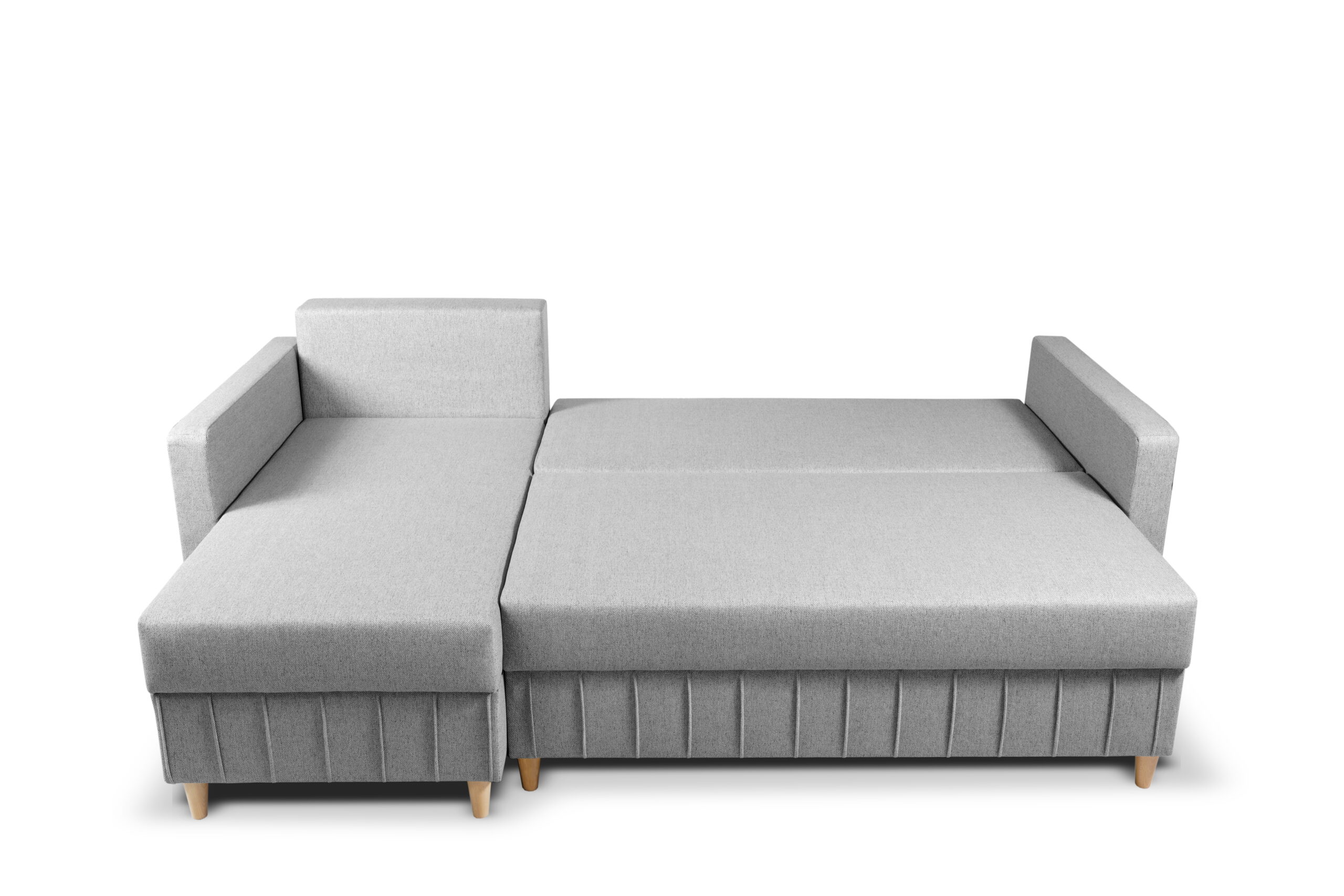 Siedzisko narożnika zostało wyposażone w sprężyny bonell, które gwarantują elastyczność, stabilność i komfort, a jednocześnie zapewniają trwałość na długie lata. Model posiada dwa pojemniki na pościel, dzięki czemu idealnie sprawdza się w mniejszych przestrzeniach, gdzie liczy się każdy centymetr miejsca do przechowywania.