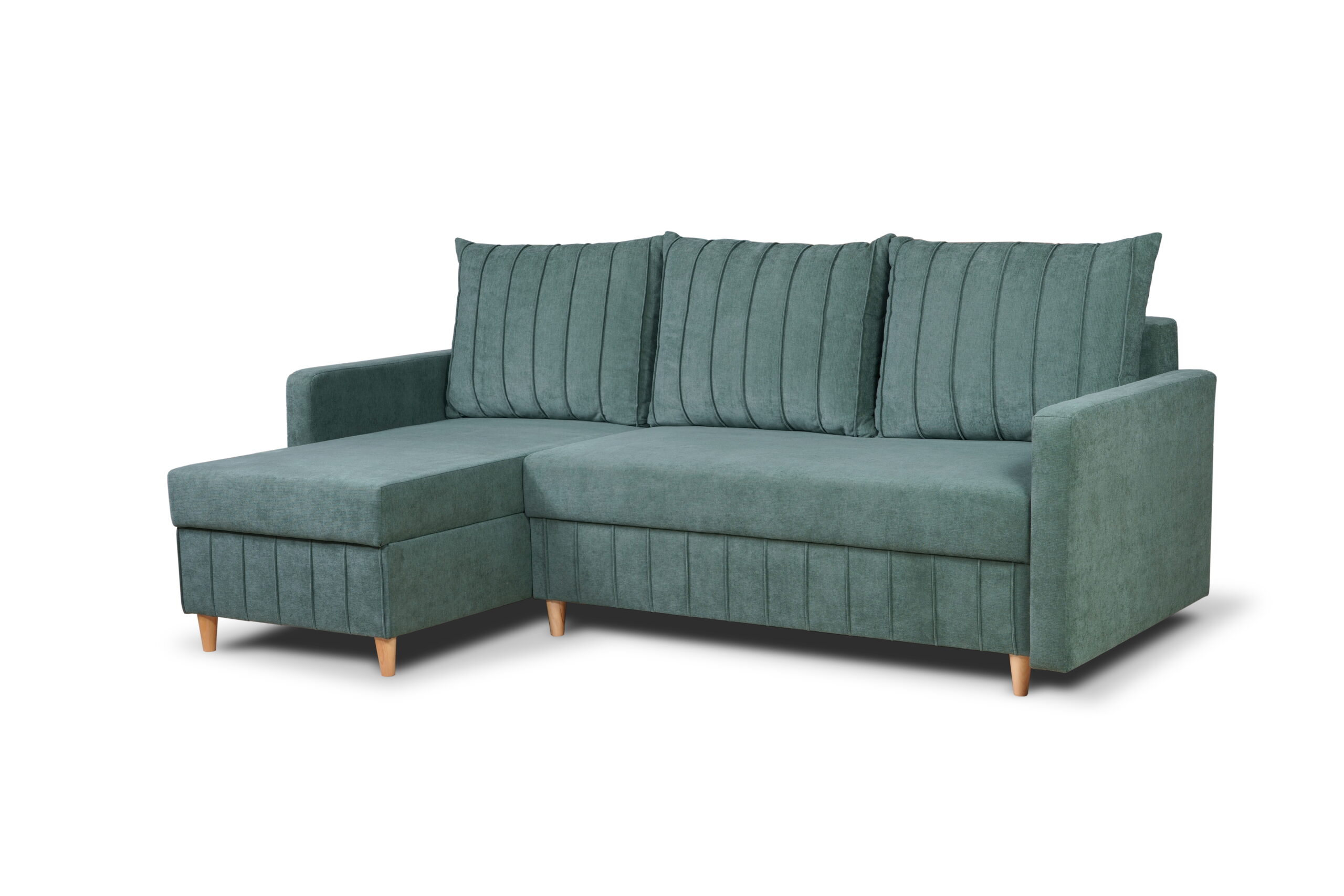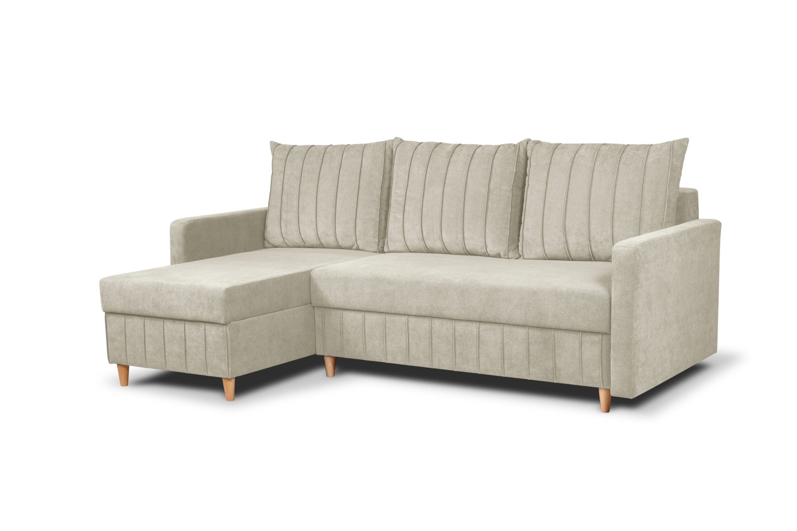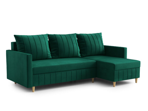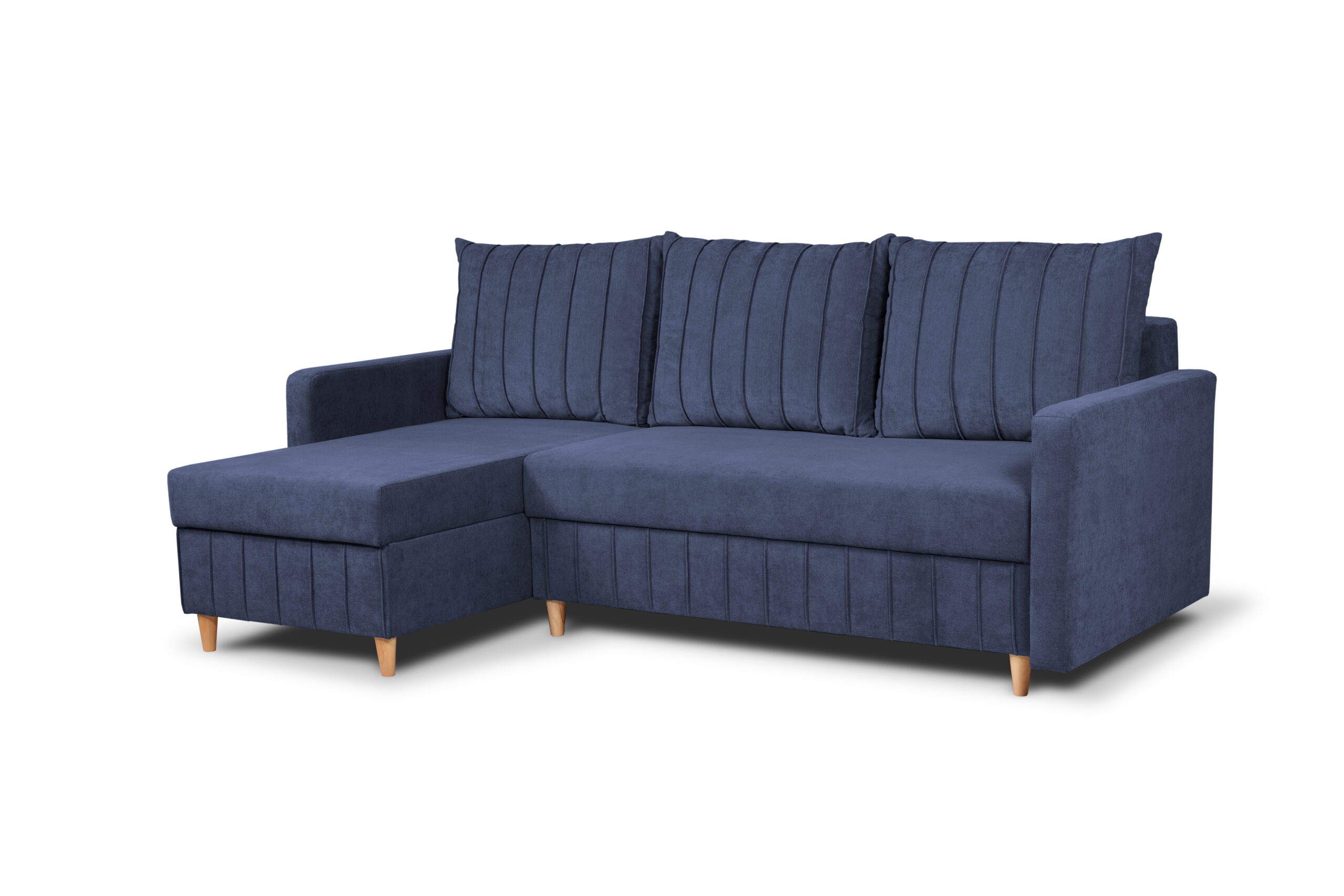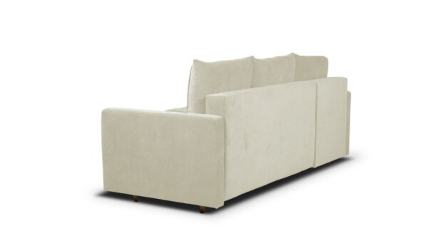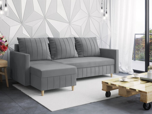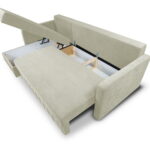 Siedzisko narożnika zostało wyposażone w sprężyny bonell, które gwarantują elastyczność, stabilność i komfort, a jednocześnie zapewniają trwałość na długie lata. Model posiada dwa pojemniki na pościel, dzięki czemu idealnie sprawdza się w mniejszych przestrzeniach, gdzie liczy się każdy centymetr miejsca do przechowywania.