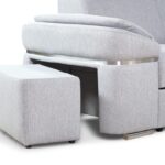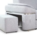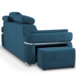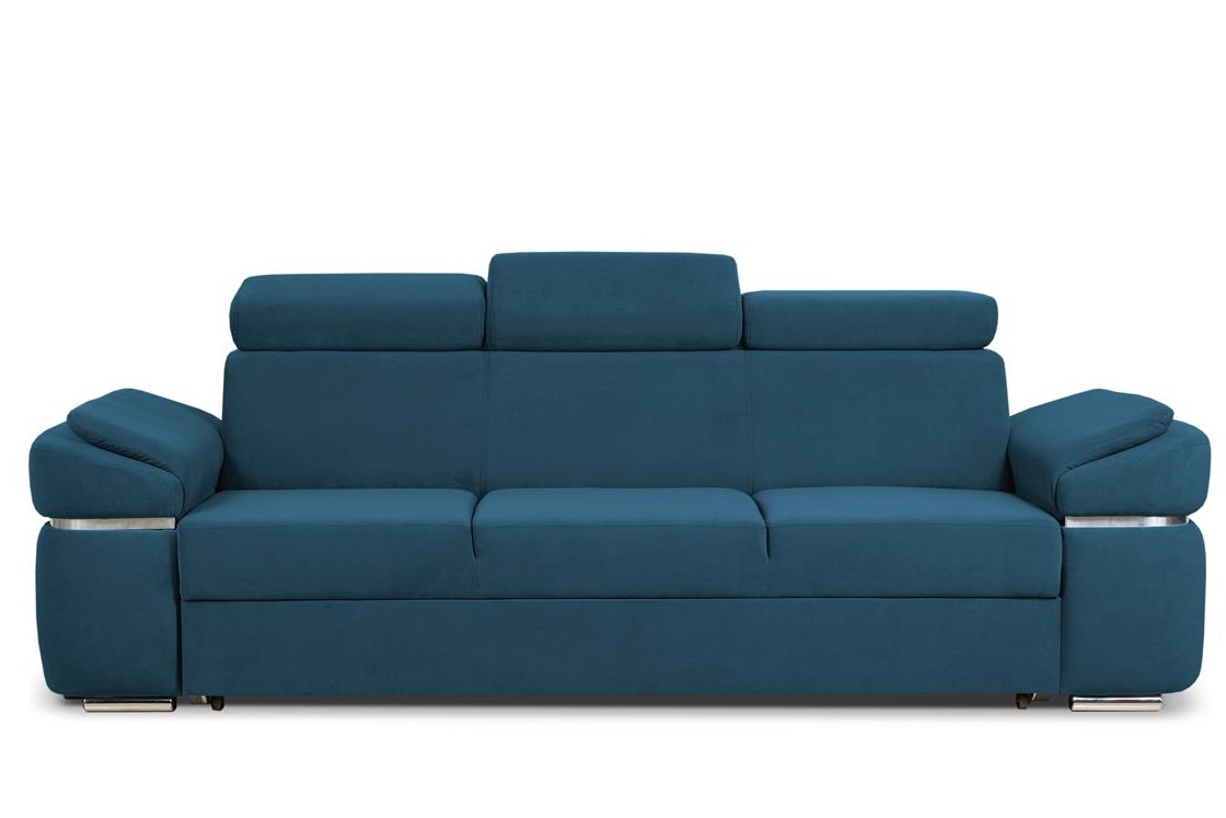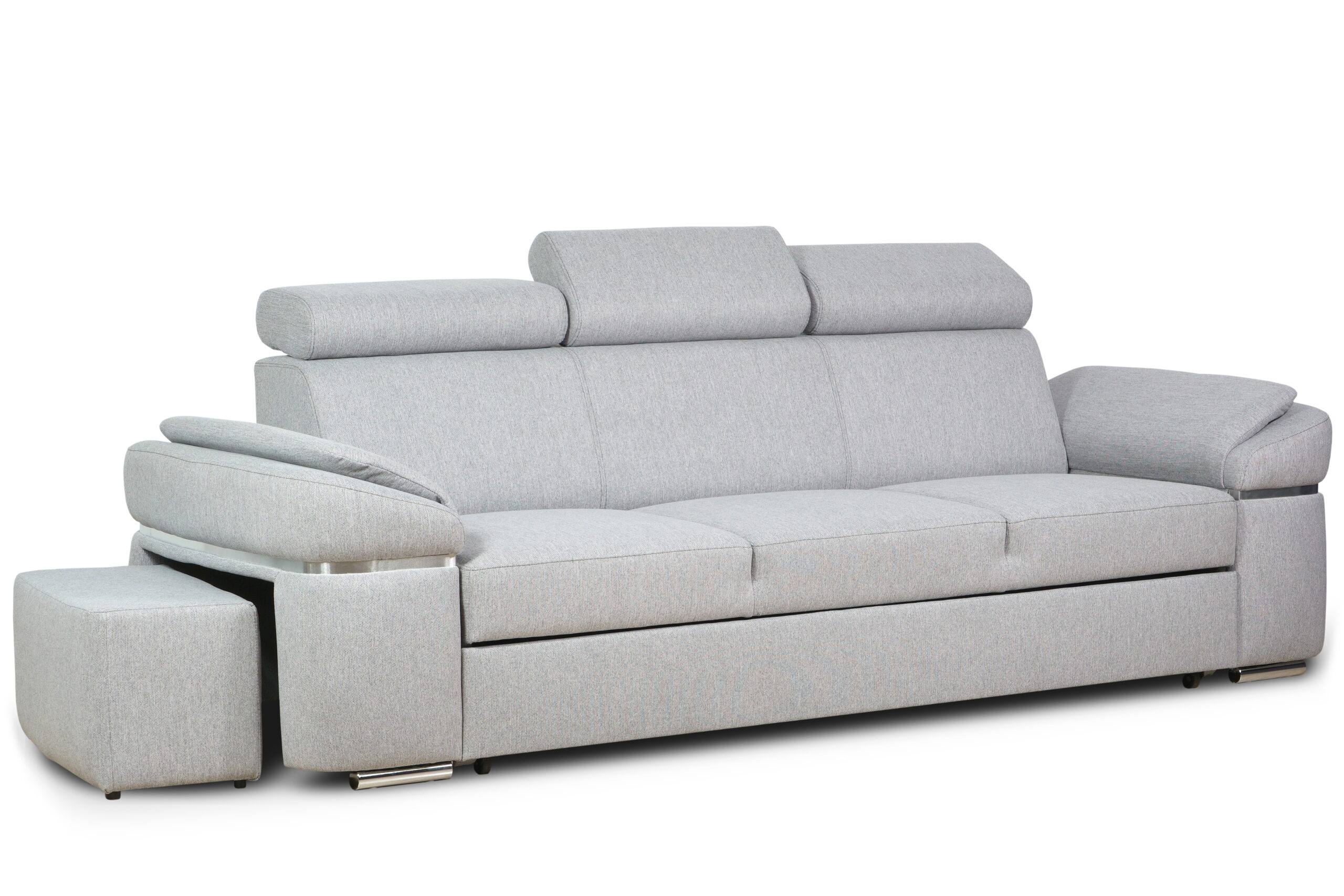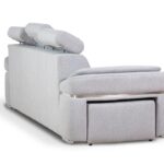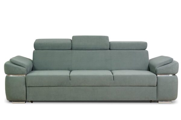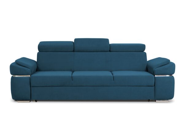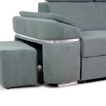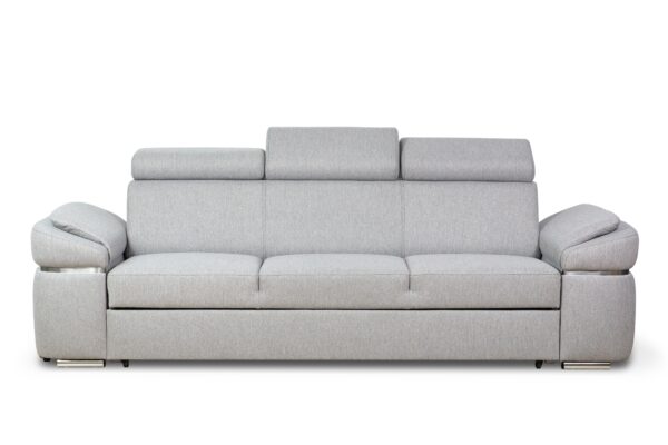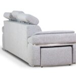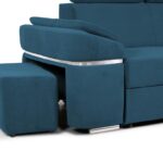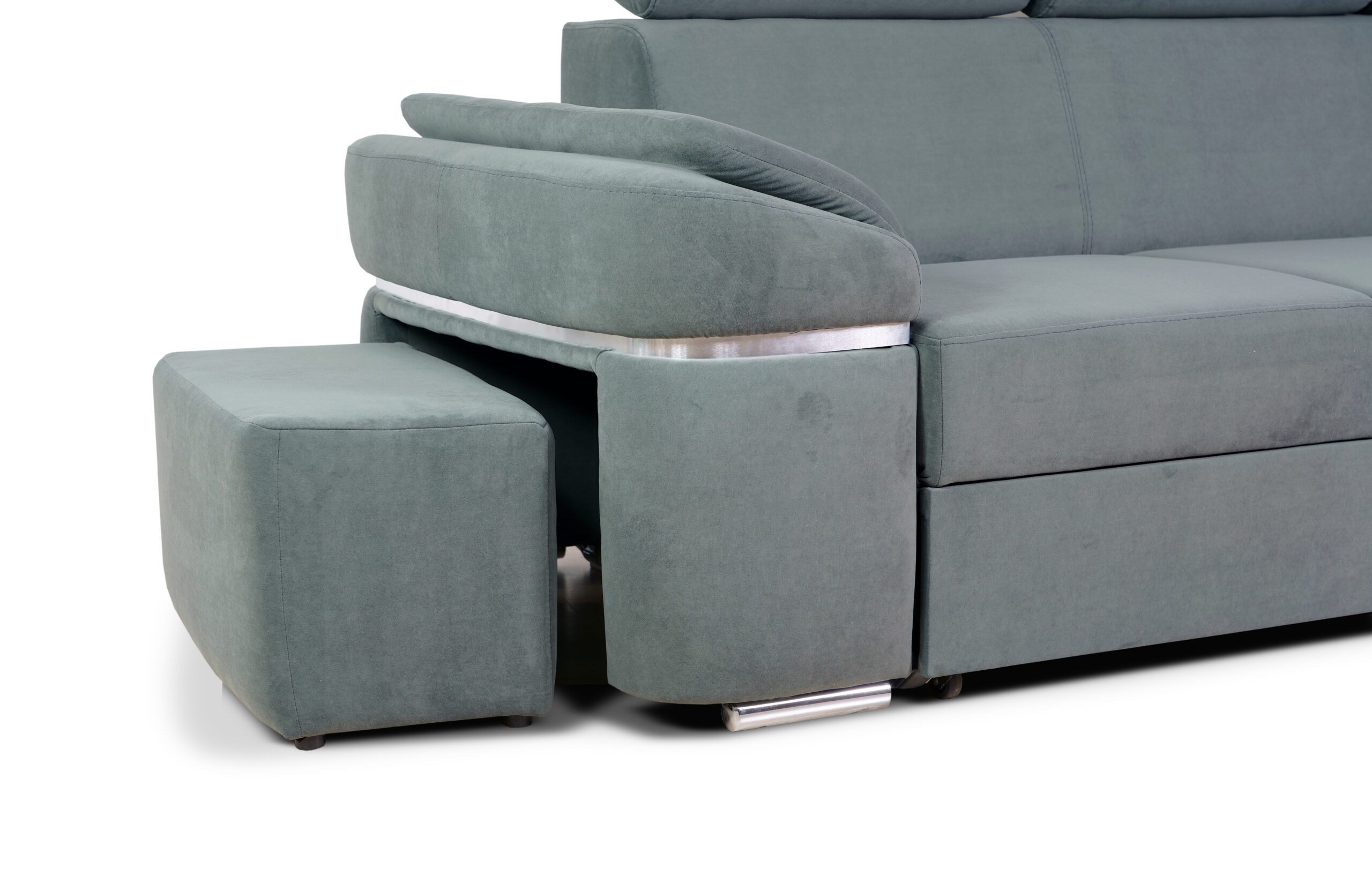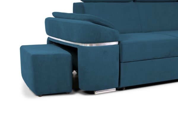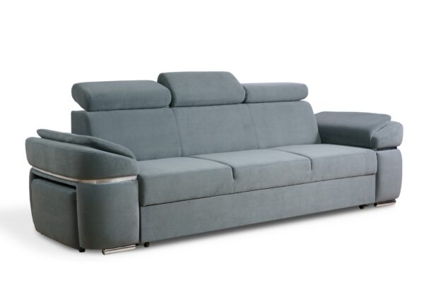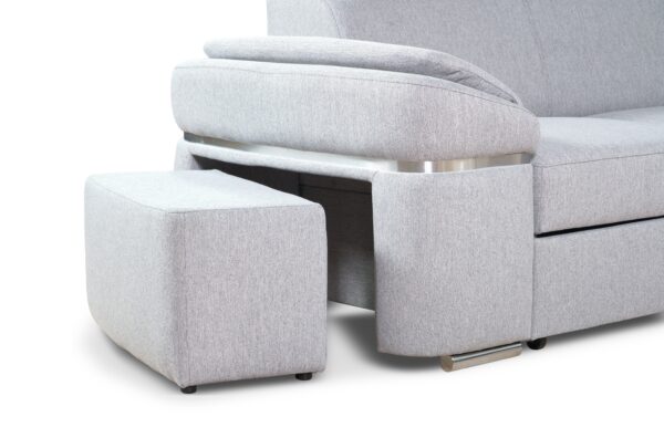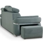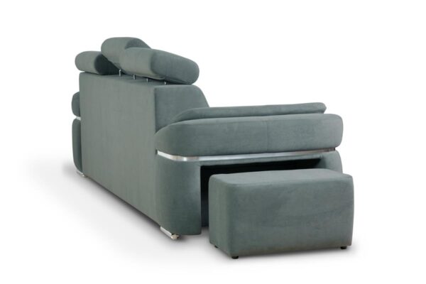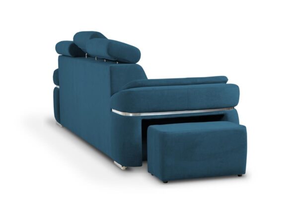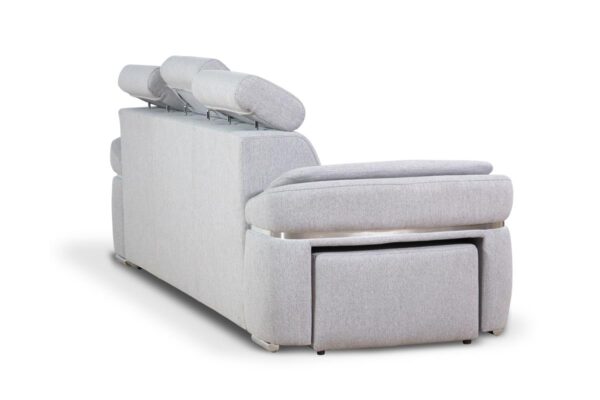 Dodatkowym udogodnieniem jest puf chowany w boku sofy, który może służyć jako dodatkowe siedzisko, podnóżek lub praktyczny element dekoracyjny. Sofa posiada również trzy ruchome zagłówki, które można regulować, dopasowując pozycję do indywidualnych potrzeb.